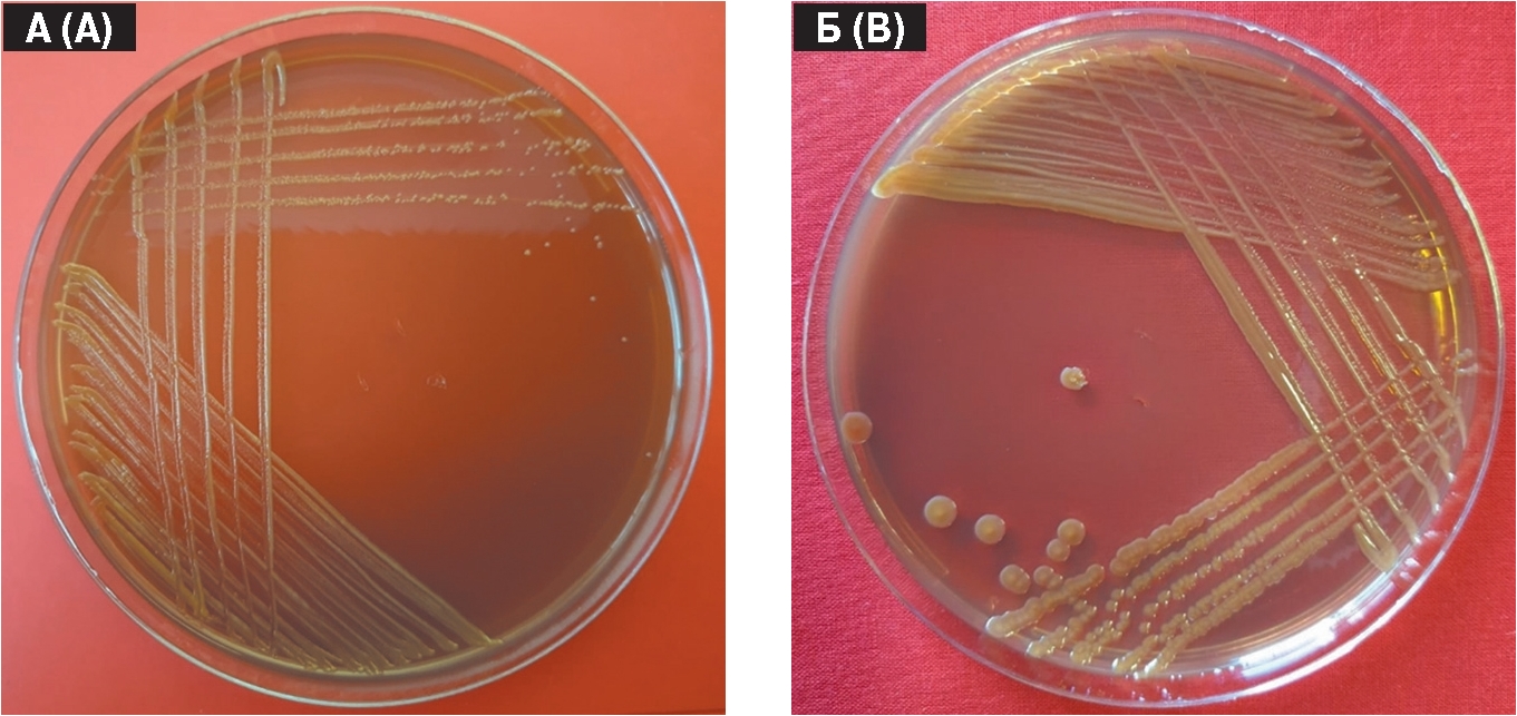 Рисунок. Стадии роста бактерий C. indologenes семейства Weeksellaceae, где изображения А) и Б) соответствуют культивированию на 1 и на 5 сутки