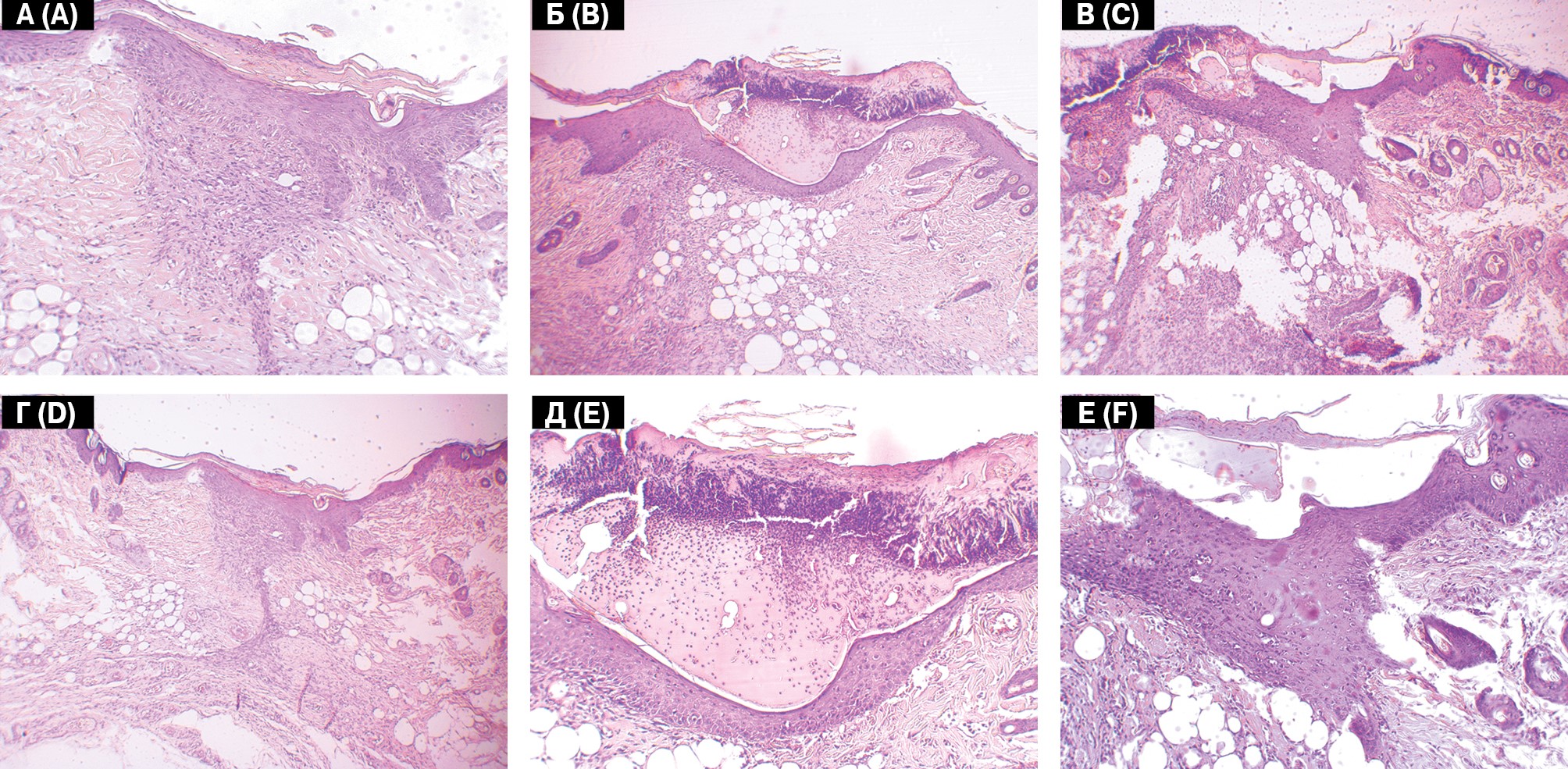 На всех анализируемых микропрепаратах образцы кожи представлены эпидермисом, дермой и гиподермой. У животных контрольной группы выявляются выраженные изменения воспалительно-деструктивного характера, затрагивающие дерму и гиподерму. В ряде случаев к окончанию эксперимента полного восстановления эпидермиса в области дефекта не наблюдалось (рис. 2А, Г). В подлежащей дерме выявляются очаги некроза жировой и соединительной ткани, сопровождаемые инфильтрацией лимфоцитами, плазматическими клетками и макрофагами, преимущественно в виде демаркационного вала. По периферии раневого дефекта в окружающих тканях отмечается отек, периваскулярные кровоизлияния, маргинация лейкоцитов в просвете мелких артерий.