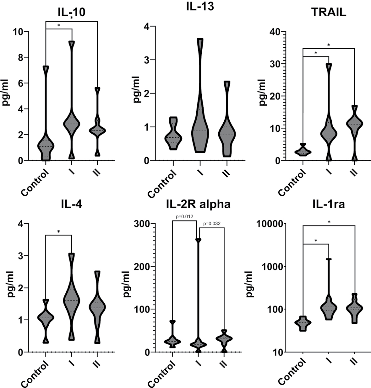 Среди всех исследованных показателей у людей контрольной группы лишь несколько не имели достоверных различий с показателями пациентов основных групп: IL-12p40, IL-13, IL-3, LIF, M-CSF, MCP-3. Общая картина различий по основным исследуемым цитокинам заключалась в достоверной гиперцитокинемии в основных группах в сравнении с контрольной по большинству исследованных параметров, за исключением обратной картины по уровню IL-2, TNFβ, IFNα2, G-CSF, IL-2Rα. Сывороточные значения Eotaxin, IL-17, IL-2Rα, IL-4 не различались между группой контроля и пациентами с виремией (группа II). Между представителями основных групп достоверные различия были зафиксированы по уровням IL-2Rα, IL-8, IP-10, MCP-1, MIG.