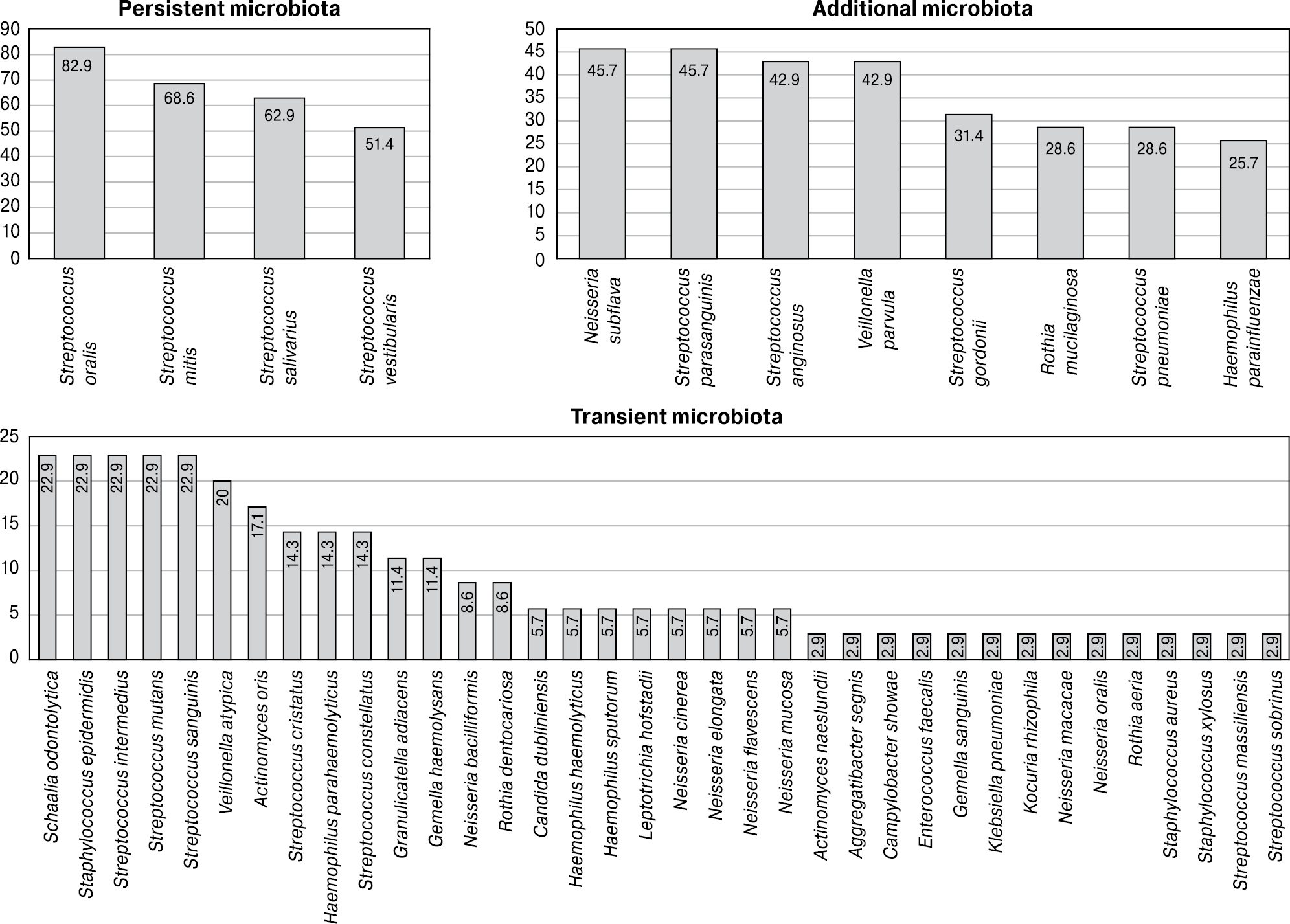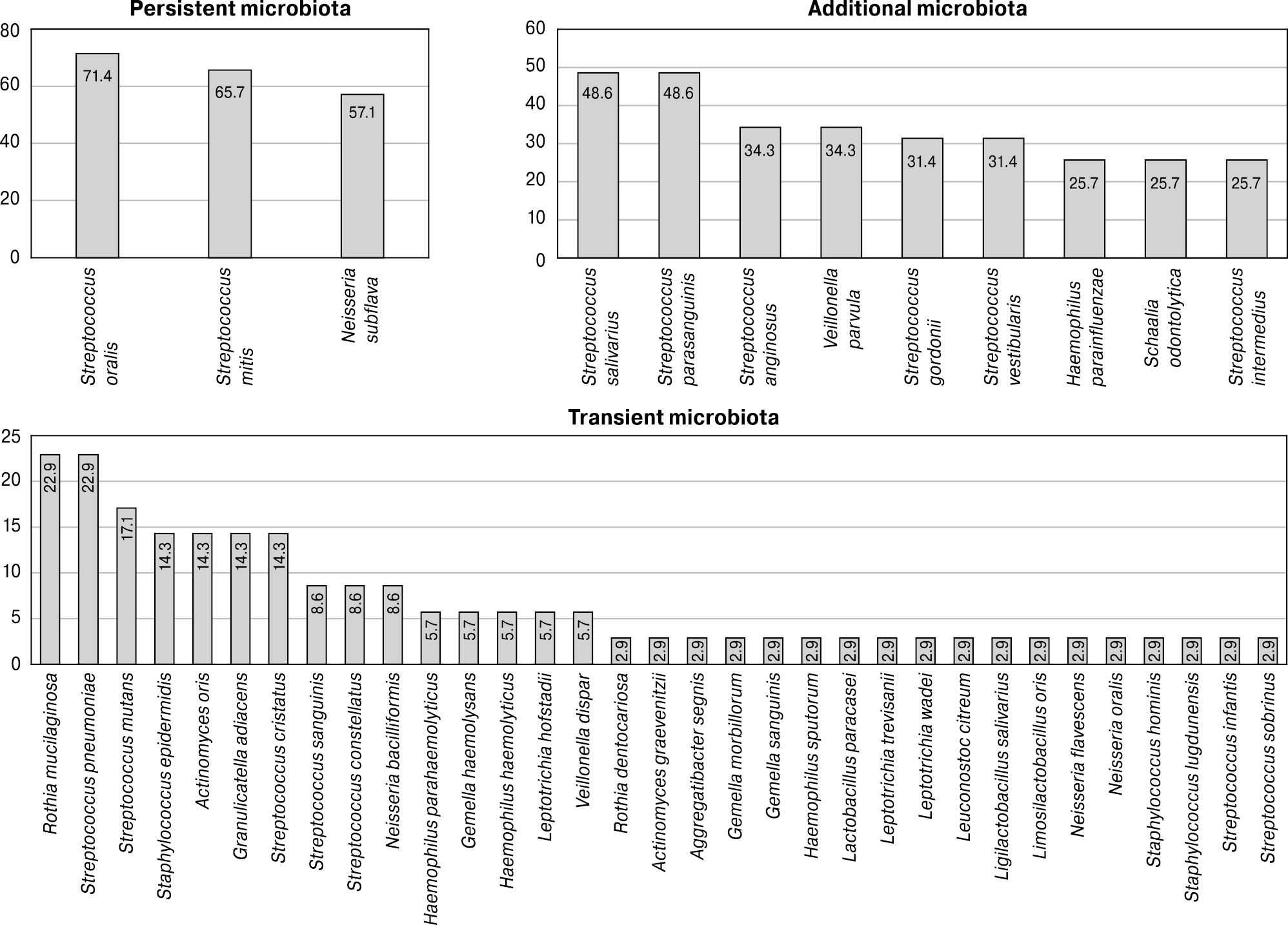 The constant microbiota for samples both before and after UV treatment consisted of two Streptococcus spp. species: S. oralis and S. mitis. After UV treatment S. vestibularis and S. salivarius were transferred to the additional microbiota, and N. subflava became part of the constant microbiota.