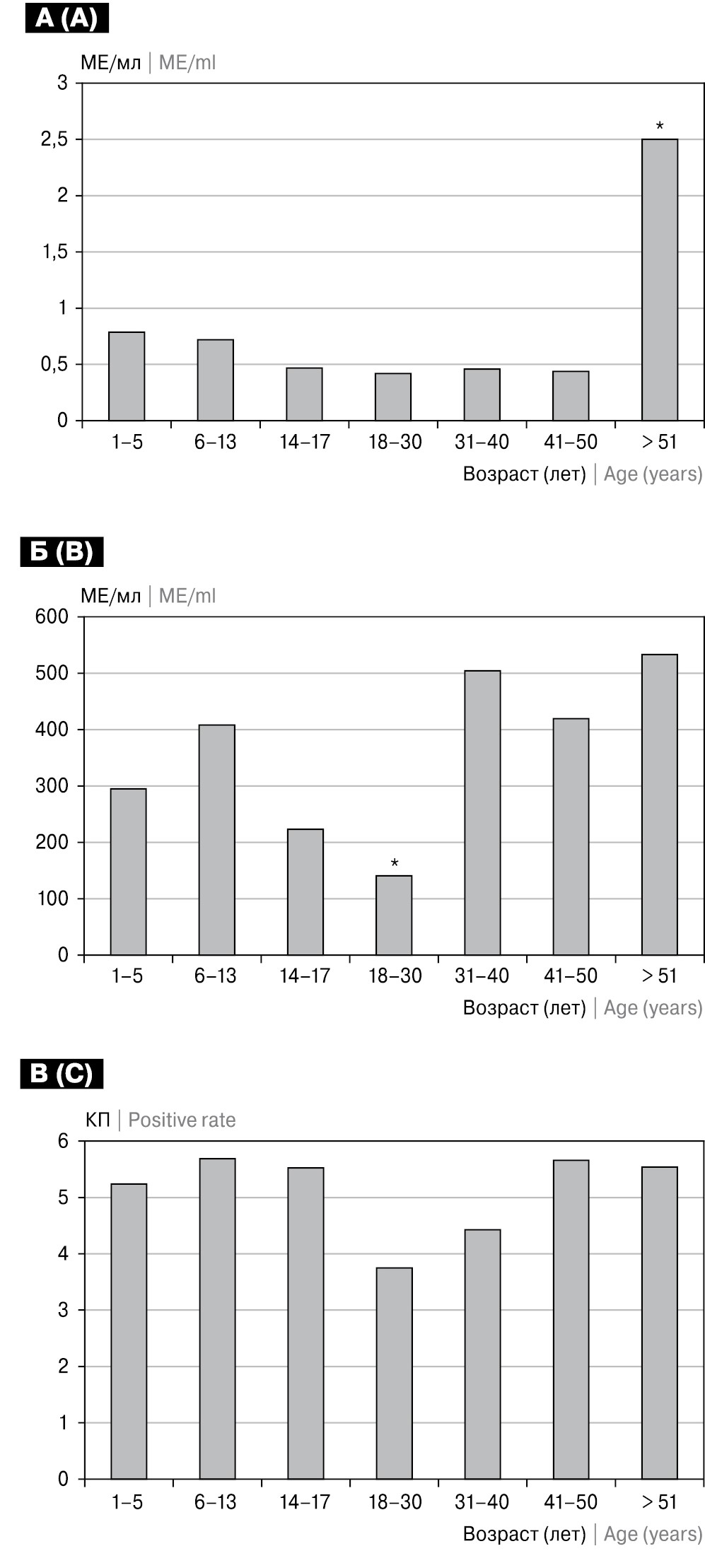 Рисунок 1. Медиана концентрации IgG-антител к вирусам кори, краснухи и эпидемического паротита в сыворотке крови серопозитивных здоровых людей в зависимости от возраста. А. Антитела к вирусу кори. Б. Антитела к вирусу краснухи. В. Антитела к вирусу эпидемического паротита Примечание. *p < 0,05.