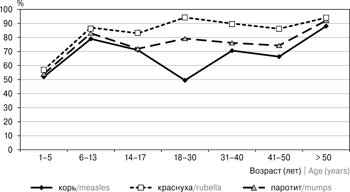 Abstract. Measles, rubella and mumps are viral infections that can be prevented with highly effective vaccines. Recently, the incidence of measles and mumps has increased in many countries, involving highly immunized populations. The aim of the study was to assess measles, rubella and mumps humoral immunity in healthy people of different ages and compare these data with measles incidence in same area during the same time period. The serum samples from 713 conditionally healthy residents of different ages from Moscow and the Moscow region with an unknown vaccination history and from 700 patients with measles collected on the 4th-5th day after onset of rash were examined. Humoral immunity was determined by ELISA using the kits from Vector-Best (Russian Federation) and Euroimmun (Germany). It was found that in the group of 1–5-year-old subjects, the seropositivity rate was below 60%. Seroprevalence in groups over 6-year-old subjects against rubella fluctuates at the level of 87–94%, mumps — 72–83%. The most unstable situation was observed in humoral immunity against measles virus. In the group of 6–13-year-old subjects, seroprevalence increased to 79% followed by decline to 49.5% in group of 18–30-year-old subjects. The subsequent increase in seropositivity to 88.12% in the group over 51-year-old subjects was significantly lower than the calculated population immunity level (95%). Among measles patients in 2024, children and adolescents accounted for 54.32%. Comparison of measles incidence with the measles seronegative level in the same age groups revealed a clear pattern: the more seronegative were subjects, the higher measles incidence was in this group. In a similar study on measles incidence in 2013, all children and adolescents responded to the infection with a primary immune response, and among adult patients, a secondary immune response was detected in 12–18%. In 2024, among children and adolescents with measles, 9–12% responded with a secondary immune response, and in adult groups, the proportion of secondary response reached 44%, indicating that individuals vaccinated in childhood but who lost measles antibodies during life actively contribute to measles cases. Vaccination of seronegative grades 10–11 adolescents is necessary.