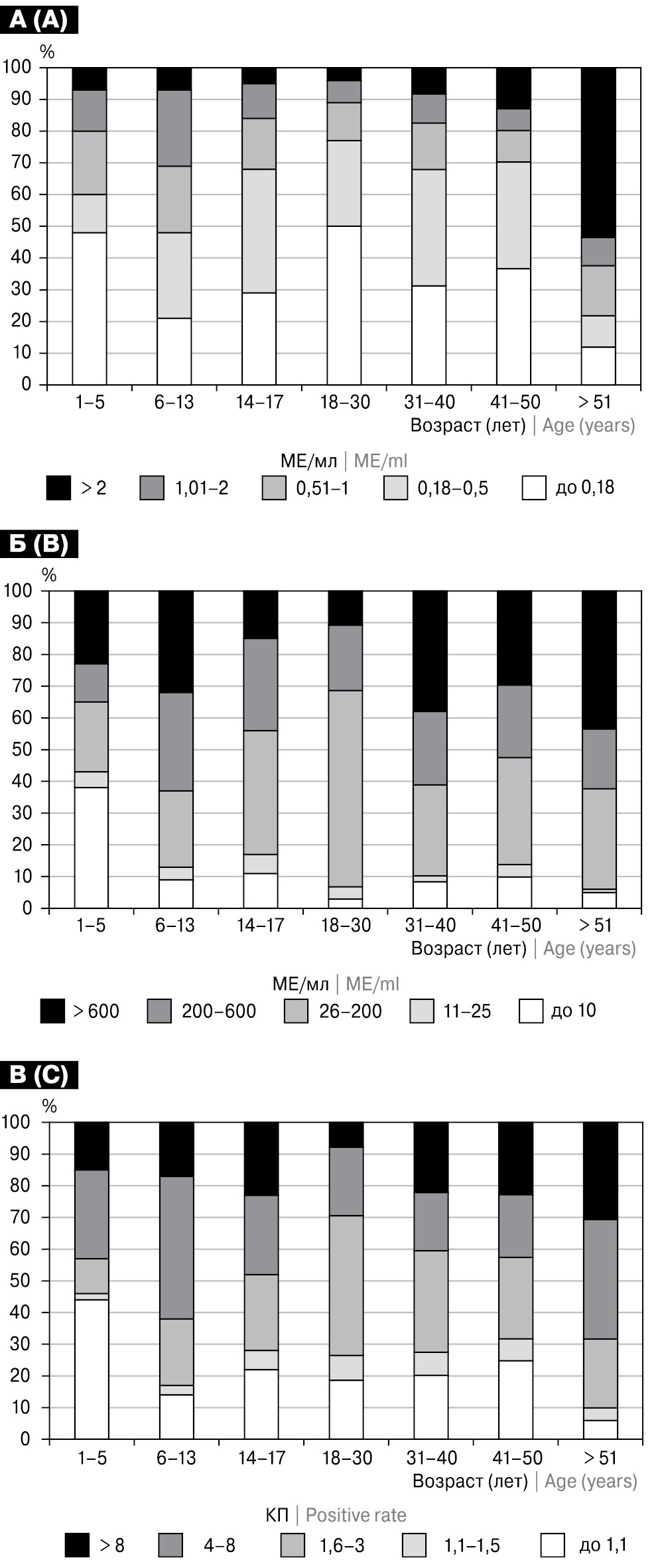 Рисунок 3. Структура гуморального иммунитета к вирусам кори, краснухи и эпидемического паротита в зависимости от концентрации IgG-антител и возраста обследованных. А. Антитела к вирусу кори. Б. Антитела к вирусу краснухи. В. Антитела к вирусу эпидемического паротита