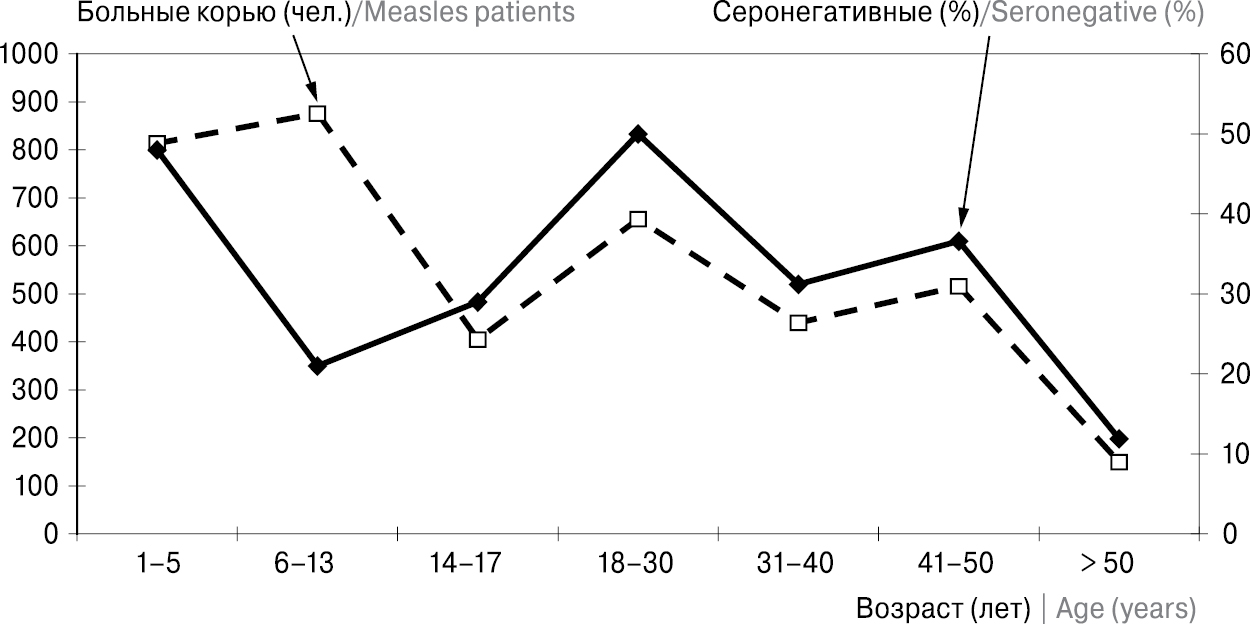 Рисунок 4. Сопоставление заболеваемости корью с уровнем серонегативных к вирусу кори лиц по возрастным группам