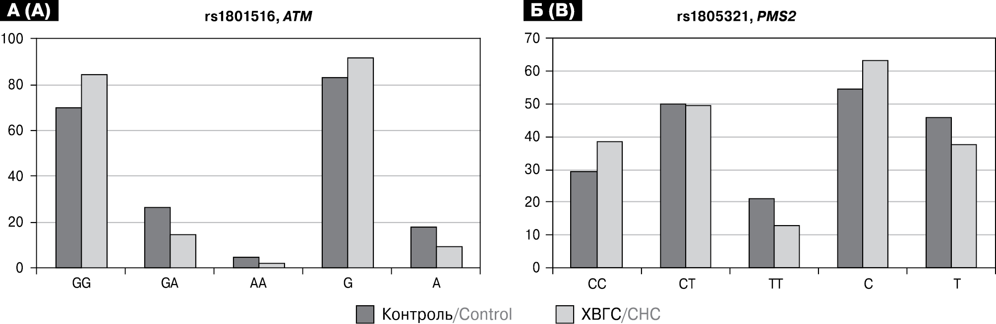 Для двух изученных маркеров (rs1801516 в гене ATM и rs1805321 в гене PMS2) выявлены статистически значимые различия по частотам аллелей/генотипов между исследованными группами (табл. 2).