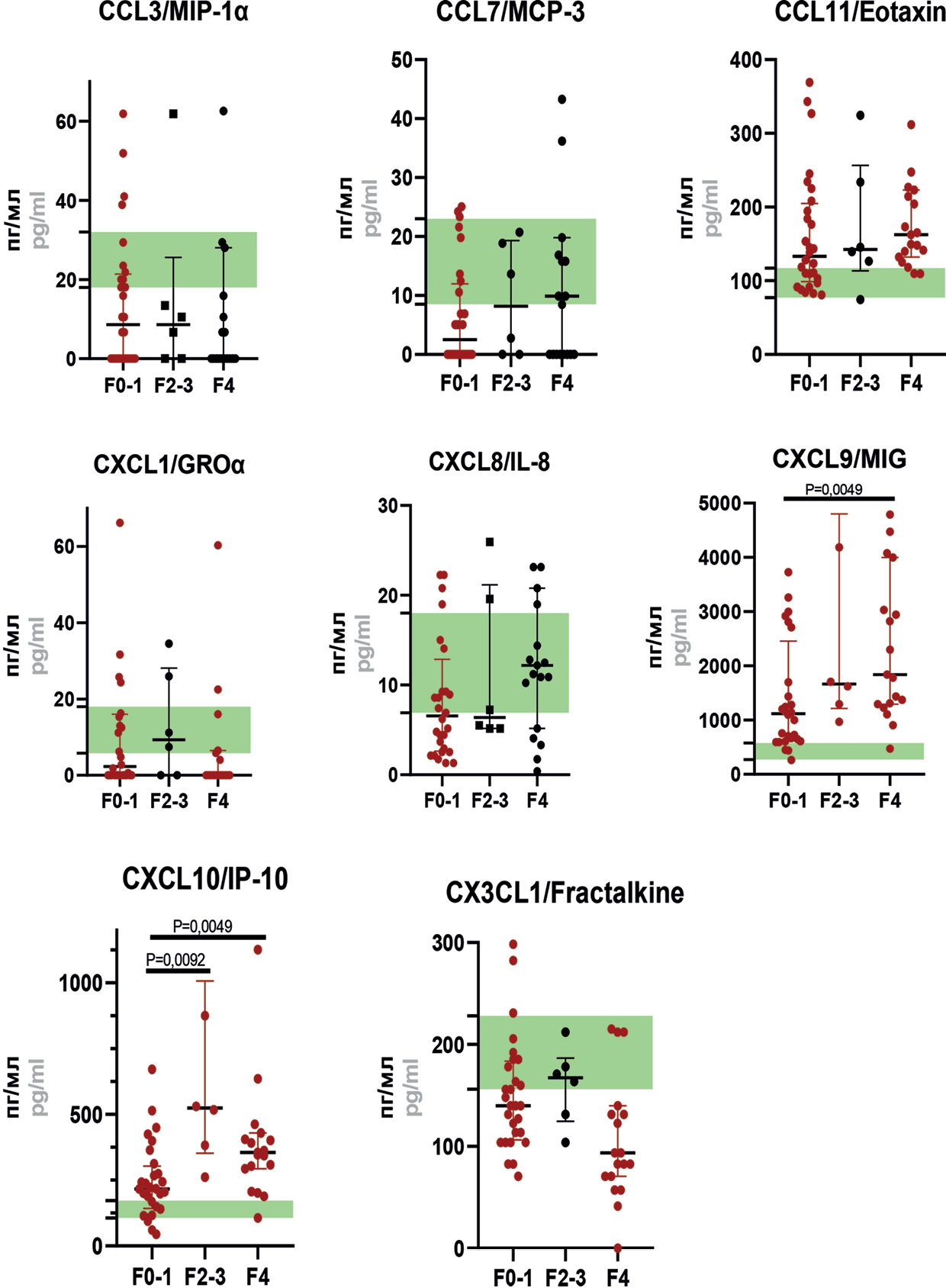 Анализ хемокинов при различных стадиях фиброза печени выявил достоверно повышенные концентрации CXCL9/MIG в группе F4 и CXCL10/IP-10 в группах F2–3 и F4 по сравнению с группой F0–1.
