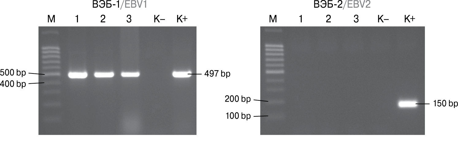В качестве контрольных материалов при дифференциальной ПЦР использованы положительный контроль (К+) — ДНК ВЭБ-1, ДНК ВЭБ-2, ДНК ВГЧ-6В, полученная нами в предыдущих исследованиях из лейкоцитов периферической крови пациентов с ОИМ ВЭБ- или ВГЧ6-этиологии, а также отрицательный контроль (К–) — деионизированная вода I типа.