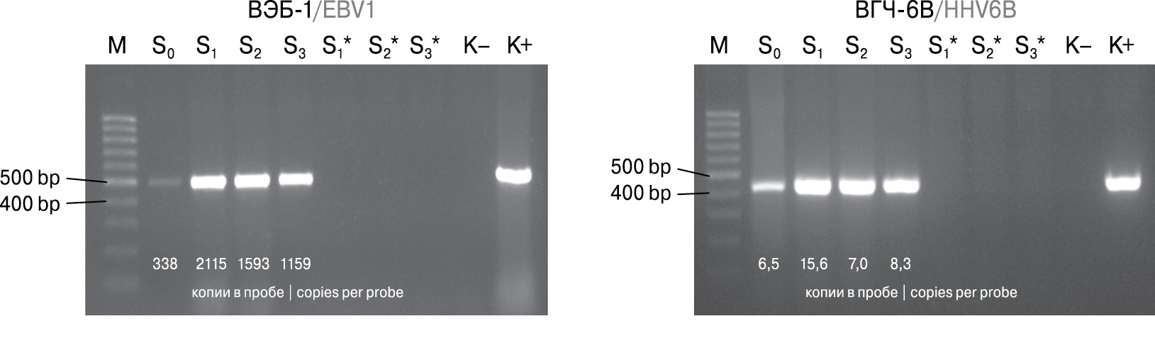 По результатам однораундового дифференциального ПЦР-анализа после выполнения процедуры дополнительной пробоподготовки слюны ранее дискордантные пробы стали положительными на ВЭБ-1 и ВГЧ-6В. Как общая тенденция отмечалось повышение качества визуализации специфических ПЦР-фрагментов на электрофореграмме по мере увеличения концентрации вирусной ДНК в пробах (рис. 3). На примере детекции ВЭБ-1 показано, что дополнительно выявленные после применения способа 2 ВЭБ-позитивные пробы могут быть дискордантными. Установлено, что в целом подобная картина отмечалась в 5 из 8 аналогичных проб в случае низкого содержания вирусной ДНК (≤ 1 копии в пробе).