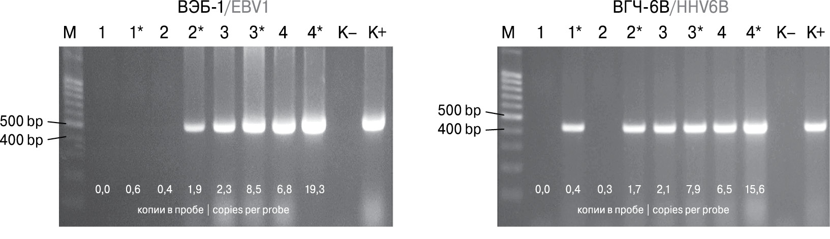 Таким образом, дифференциальная детекция ВЭБ-1/ВЭБ-2 и ВГЧ-6А/ВГЧ-6В в однораундовом варианте ПЦР в сочетании со способом 2 возможна в отношении образцов цельной слюны с минимальной концентрацией вирусной ДНК > 33 копий/мл.