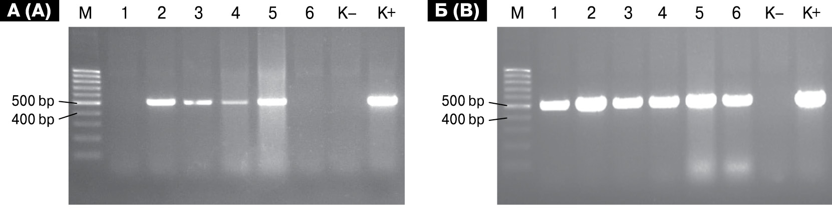 Продукты ПЦР-амплификации анализировали с помощью электрофореза в 1,8% агарозном геле, содержащем бромид этидия (0,02% по объему). В качестве стандарта для определения длины двуцепочечных молекул ДНК в интервале 100–1500 п.н. использовали маркер длин ДНК (М) 100+ bp DNA Ladder (Евроген, Россия). Результаты детектировали на трансиллюминаторе InGenius 3 с использованием программного обеспечения GeneSys (Syngene, Великобритания). Полученные данные выражали в качественном формате — положительный или отрицательный.