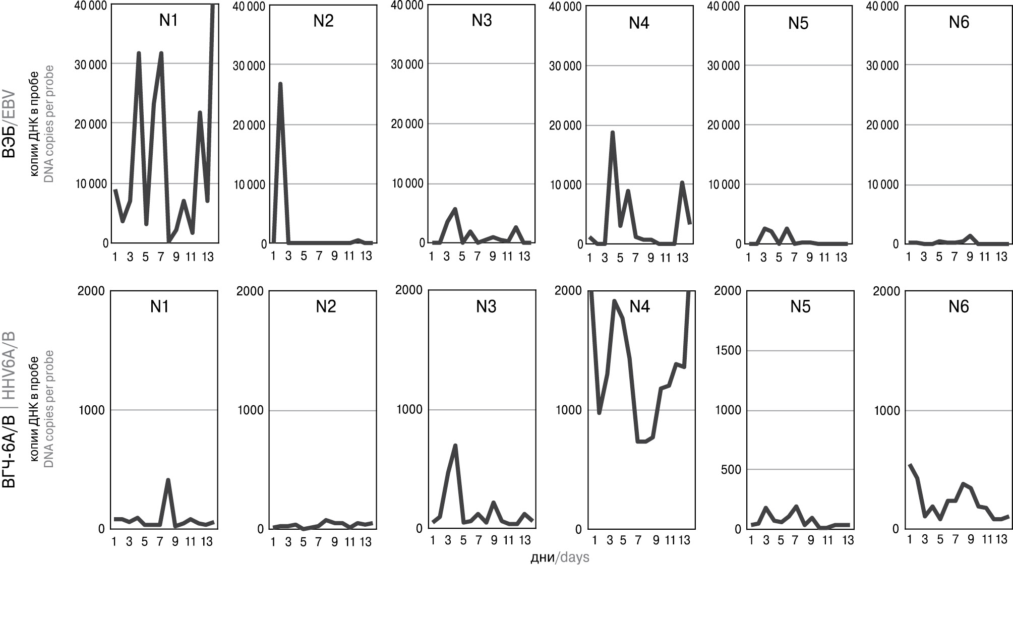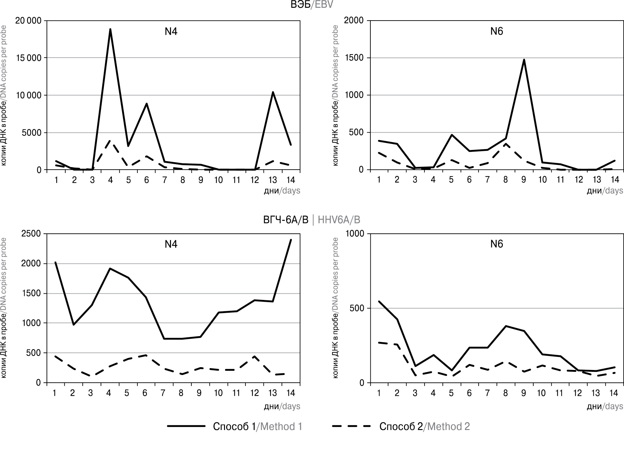 За период наблюдения пиковые концентрации ДНК ВЭБ достигали у разных доноров значений от 1475 до 54 627 копий в пробе, а концентрации ДНК ВГЧ-6А/В — от 72 до 2401 копий в пробе. В то время как у некоторых участников (N2, N3, N5) периоды непрерывного выделения ВЭБ сменялись периодами отсутствия его детекции в слюне, у других (N1, N4, N6) отмечалось обнаруживаемое выделение вируса в течение всего времени наблюдения. Результаты исследования свидетельствуют о том, что в зависимости от дня, на который приходился сбор биоматериала, участники N2, N3 и N5 могли рассматриваться либо как ВЭБ-позитивные лица, выделяющие вирус с разной степенью интенсивности, либо, наоборот, как ВЭБ-негативные индивиды. Для детекции ДНК ВГЧ-6А/В применение способа 2 полностью нивелировало данную проблему.