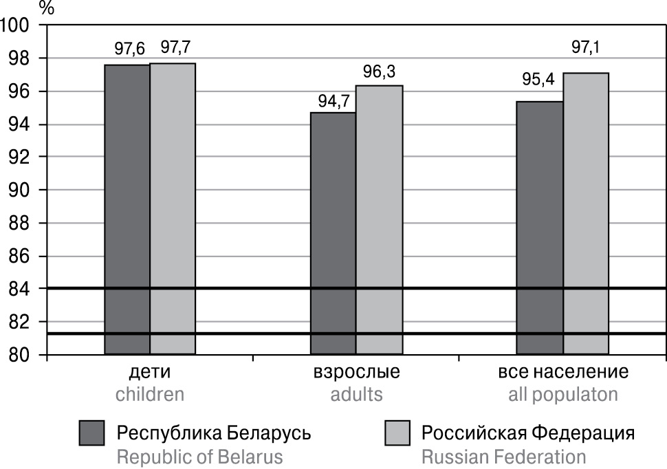 Рисунок. Доля серопозитивных к краснухе среди детей и взрослых в Республике Беларусь и Российской Федерации в 2019 г.