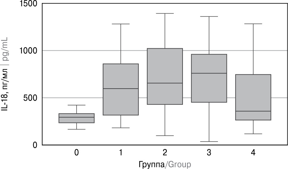 При анализе диаграмм (рис. 1–4) («ящиков с усами», наглядно демонстрирующих различия между медианами различных групп и расположение квартилей 25 и 75), обращают на себя внимание значения IL-6, VEGF-A и IL-18, которые при ИЭ отличаются не только от контрольных, но и имеют отчетливые межгрупповые различия. В частности, распределение медиан фактора роста эндотелия сосудов (рис. 2) показало статистически значимую разницу между всеми группами сравнения (p < 0,05).