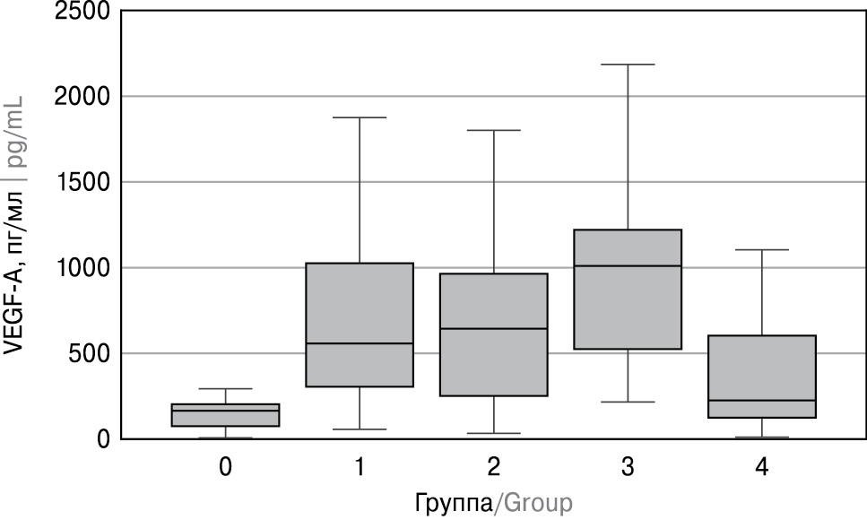 VEGF-А, pg/mL | 558,40 (268,74–1032,06) | 648,60 (249,94–985,39) | 1010,08 (333,40–1226,66) | 226,00 (112,04–612,50) | 166,05 (68,68–203,55) |