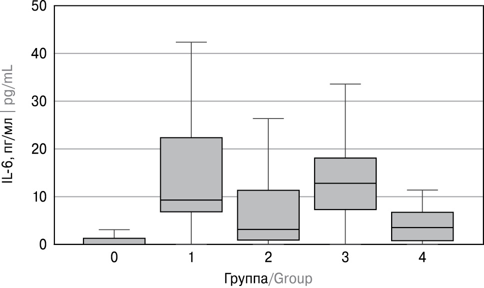 IL-6, pg/mL | 10,58 (6,86–32,91) | 3,35 (2,03–20,04) | 14,97 (7,77–33,60) | 6,42 (1,50–12,32) | 0,00 (0,00–1,35) |