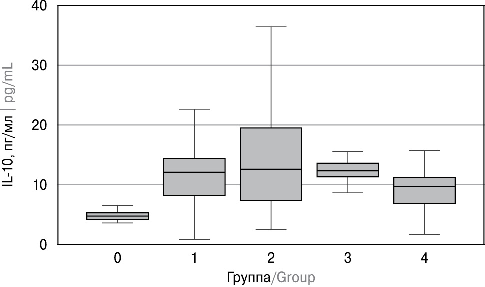 Согласно результатам проведенного исследования медиана, IL-8 (провоспалительного хемокина CXCL8) была статистически выше физиологической у пациентов с ИЭ, однако наибольшее увеличение его концентрации наблюдалось при вторичном ИЭ — до 5 раз. Наряду с моноцитами/макрофагами и эпителиоцитами, продуцентами IL-8 являются эндотелиальные клетки, активируемые как прямыми контактами с патогенами, так и с провоспалительными цитокинами — IL-1, TNFα, IL-6, IL-17А и др. [8]. Известная способность отдельных цитокинов контролировать синтез других подтверждается, в частности, эффектами моноцитарных TNFα и IL-1β, способных индуцировать синтез моноцитами IL-10, который, в свою очередь, угнетает выработку провоспалительных цитокинов [17].