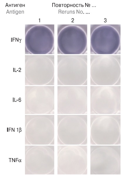 Лиофилизат каждого из антигенов растворяли в необходимом количестве среды AIM V® + AlbuMAX® до достижения концентрации 10 мкг/мл и хорошо перемешивали. Приготовленные рабочие растворы антигенов по 100 мкл в трех повторностях вносили в лунки планшета и проводили испытание согласно инструкции по применению теста. Постановка теста не предусматривала внесение в лунки МКПК.
