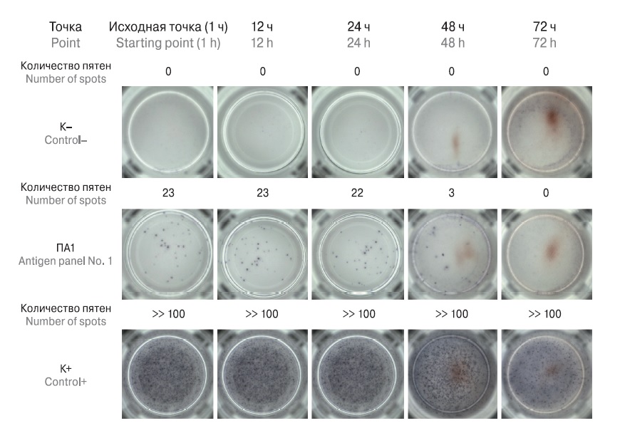 Анализ ELISPOT — это метод определения количества отдельных Т-клеток, секретирующих цитокин, после стимуляции определенным антигеном или пептидом, проявляющихся в виде пятен на нитроцеллюлозной мембране [3, 12, 15]. Как правило, количество пятен увеличивается пропорционально силе иммунного ответа. Важным преимуществом метода ELISPOT является прямое измерение уровня иммунного ответа, опосредованного клетками Th1.