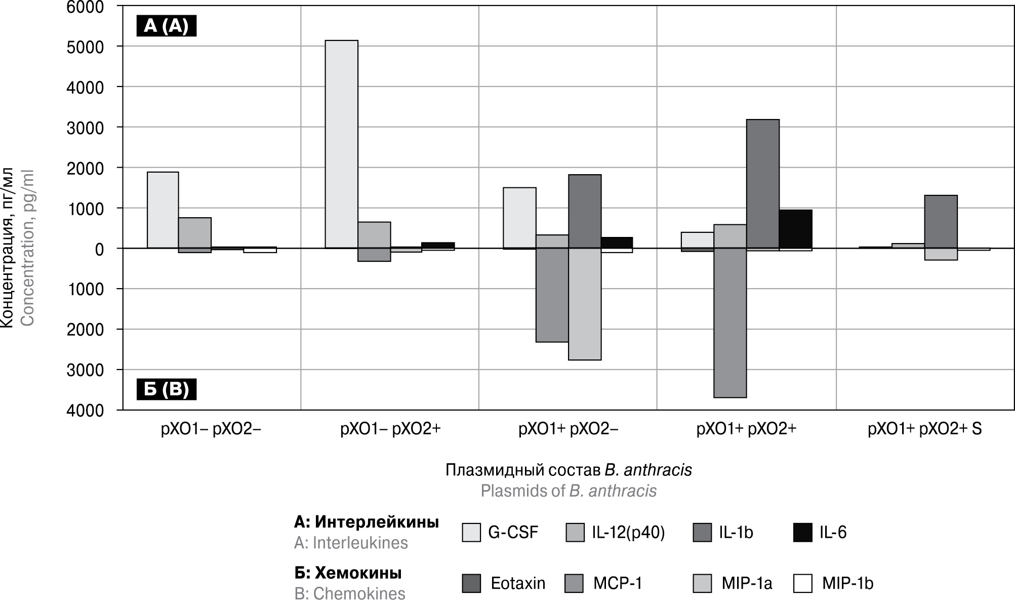 Рисунок. Концентрация цитокинов в культуральной жидкости при инфицировании линии макрофагоподобных клеток J774A штаммами B. anthracis с разным плазмидным составом