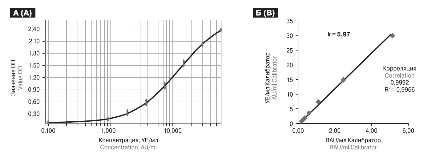 Перерасчет значений условных единиц в международно признанные единицы, проведенный путем сопоставления калибровочной кривой, построенной по значениям УЕ/мл, с калибровочной кривой, рассчитанной по Международному стандарту ВОЗ в единицах BAU/мл, показал их полную корреляцию и связь между значениями 1BAU/мл = 5,97 УЕ/мл (рис. 1Б).