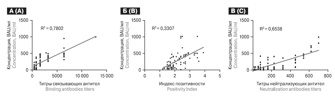 Рисунок 2. Корреляция значений концентрации N-белок-связывающих антител (BAU/мл), измеренных с использованием ИФА-набора «N-CoV-2-IgG PS» и А) титров N-белок-связывающих антител, измеренных с использованием качественного ИФА набора, Б) значений индексов позитивности, измеренных с использованием качественного ИФА-набора, В) титров нейтрализующих антител, полученных методом микронейтрализации вируса SARS-CoV-2. Примечание. Коэффициенты корреляции Спирмена c 95% доверительными интервалами для каждого анализа были: А) r = 0,8424 (0,7632–0,8967) p < 0,0001; Б) r = 0,6648 (0,5196–0,7727) p < 0,0001; В) r = 0,7410 (0,6177–0,8288) p < 0,0001. / Figure 2. Correlation between binding antibody concentration (BAU/ml) measured by «N-CoV-2-IgG PS» ELISA Kit and A) antibody titer magnitude evaluated by “SARS-CoV-2 Human IgG Qualitative ELISA Kit”, B) positivity index magnitude assessed by qualitative ELISA kit, C) neutralizing antibody titers analyzed by the SARS-CoV-2 virus microneutralization. Note. Spearman’s correlation coefficients with 95% confidence intervals for each analysis were: А) r = 0.8424 (0.7632–0.8967) p < 0.0001; B) r = 0.6648 (0.5196–0.7727) p < 0.0001; C) r = 0.7410 (0.6177–0.8288) p < 0.0001.
