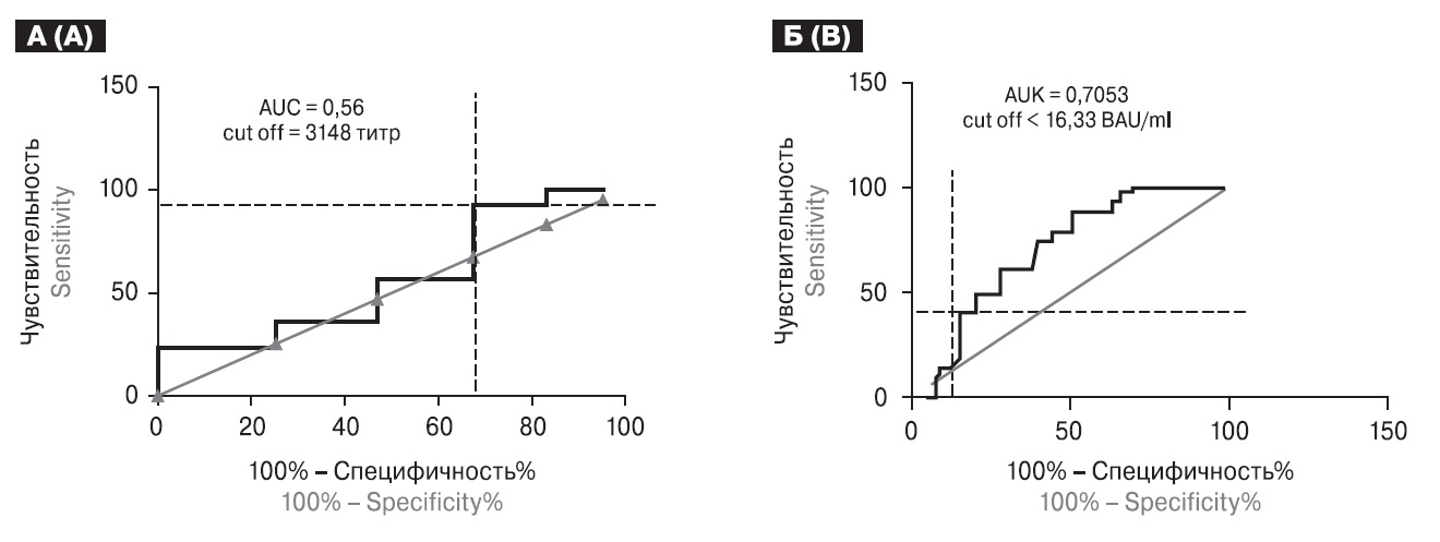 Данные AUC ROC-кривой, построенной по концентрациям связывающих антител относительно титров нейтрализующих антител, свидетельствовали о приемлемой информативности количественного набора «N-CoV-2-IgG PS» относительно теста НМВ. На рис. 3Б видно, что ROC-кривая находилась над диагональной линией, а значение баланса чувствительности и специфичности в точке порога отсечения (cut off < 16,33 BAU/ml) показало 83,55% информативности.