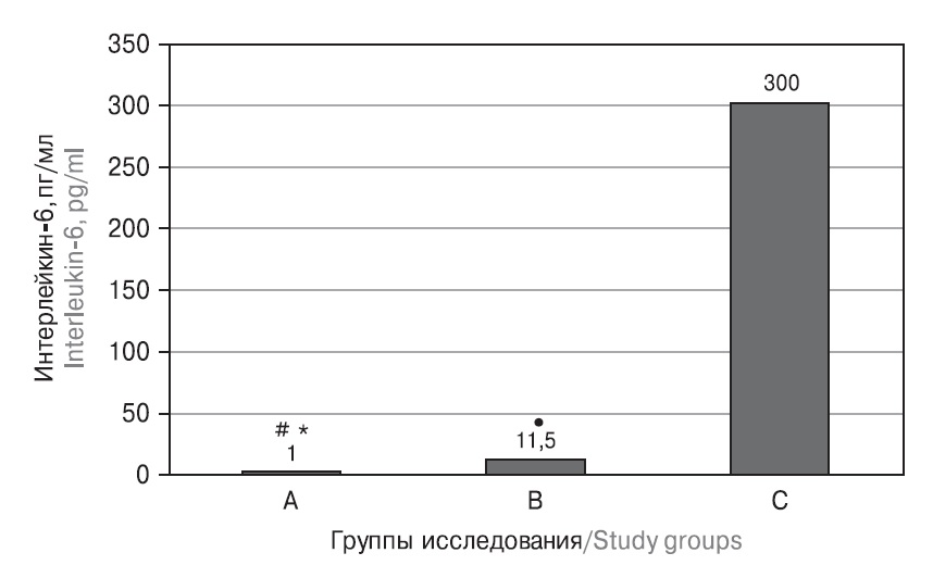 Рисунок 1. Исследование IL-6 при поступлении в стационар. Примечание. *р < 0,05 — статистически значимые отличия между группами А, В и С; #p < 0,05 — статистически значимые отличия между группами А и В; •p < 0,05 — статистически значимые отличия между группами В и С. / Figure 1. Investigation of serum IL-6 level at admission to the hospital. Note. *р < 0.05 — statistically significant differences between groups A, B and C; #p < 0.05 — statistically significant differences between groups A and B; •p < 0.05 — statistically significant differences between groups B and C.