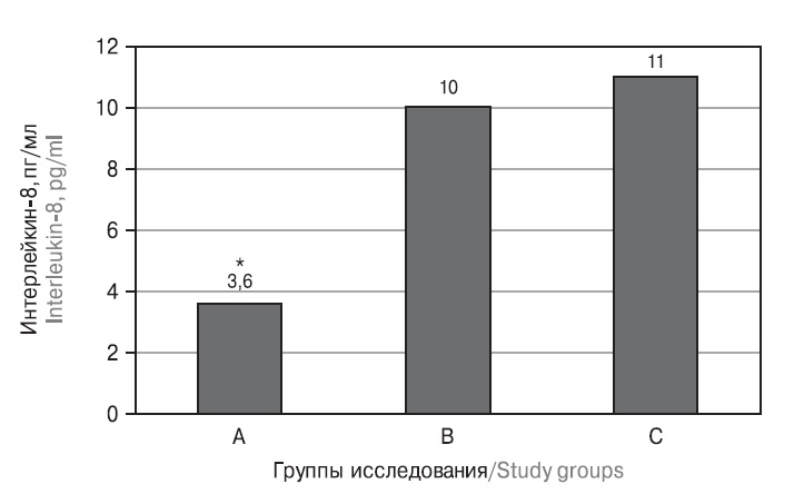 Результаты исследования IL-8 в группах представлены на рис. 2. У пациентов группы А определялась минимальная концентрация исследуемого цитокина, его медиана составляла 3,6 [1, 7; 8, 4] пг/мл, в группах В и С зарегистрировано повышение IL-8 соответственно до 10 [2, 8; 9, 5] пг/мл и 11,1 [5, 4; 15, 9] пг/мл. Выявленные отличия являются статистически значимыми (р < 0,05).