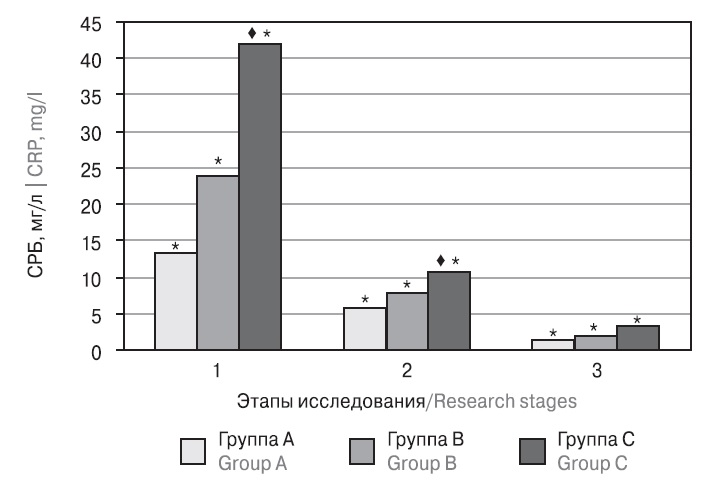 Рисунок 3. Результаты исследования СРБ в процессе лечения. Примечание. *p < 0,05-статистически значимые отличия в группе на этапах лечения; ♦p < 0,05-статистически значимые отличия между группами А и С. / Figure 3. Investigation of serum CRP level during course of treatment. Note. *р < 0.05 — statistically significant differences in the group at the stages of treatment; ♦p < 0.05 — statistically significant difference between groups A and C.