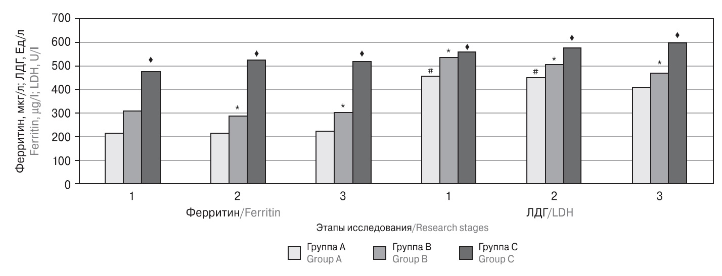 Рисунок 4. Результаты исследования ферритина и ЛДГ в процессе лечения. Примечание. *р < 0,05 — статистически значимые отличия в группе на этапах лечения; ♦p < 0,05 — статистически значимые отличия между группами А и С; #p < 0,05 — статистически значимые отличия между / Figure 4. Investigation of serum ferritin and LDH level during course of treatment. Note. *р < 0.05 — statistically significant differences in the group at the stages of treatment; ♦p < 0.05 — statistically significant difference between groups A and C; #p < 0.05 — statistically significant differences between groups A and B.