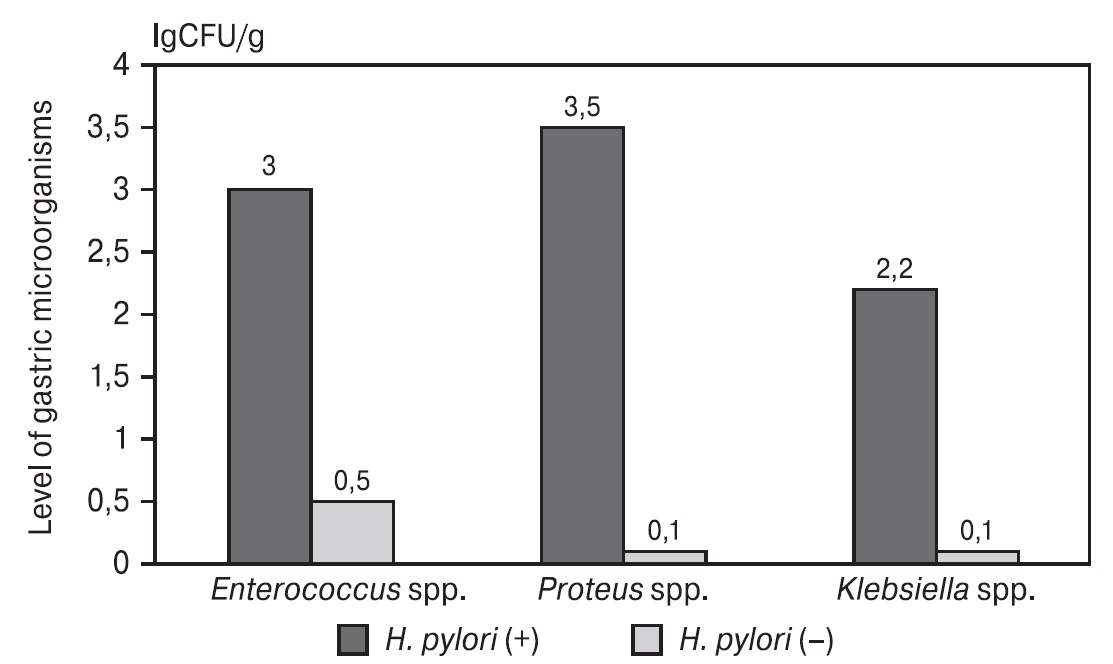 In addition to detecting H. pylori infection, we also performed a comparative analysis of gastric microbiota in the presence and in the absence of H. pylori. The viable bacteria count (CFU/g) in gastric biopsy specimens was determined by plating corresponding tenfold serial dilutions of suspensions on a number of selective dense culture media in Petri dishes and counting the bacterial colonies after incubation (24 hours) at 37°С. To determine the count of several genera of microorganisms such as E. coli, Enterococcus spp., Klebsiella spp., Proteus spp., Enterobacter spp. at the same time, we used the following chromogenic selective media: Pronadisa 1424 (Spain), HiCrome Coliform Agar (India). The lactobacilli count was determined by plating the culture on the Pronadisa 1043 Agar MRS medium (Spain) and culturing in anaerobic jars with gas generating sachets (Thermo Scientific AN0025A (USA)) at 37°C for 48 hours.