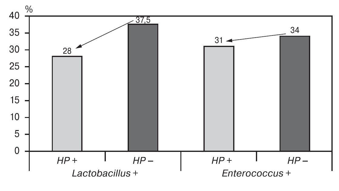 Consequently, as demonstrated on Fig. 3 and Fig. 4, we observe an increased presence of opportunistic pathogen belonging to the Enterobacteriaceae family combined with concurrent regress in numbers of colonies of enterococci and lactobacilli (non-pathogenic microorganism) in H. pylori-positive patients. We suggest that observed imbalance in gastric microbiota can be attributed as an underlying cause for development of symptoms of dyspepsia and following H. pylori-associated diseases.