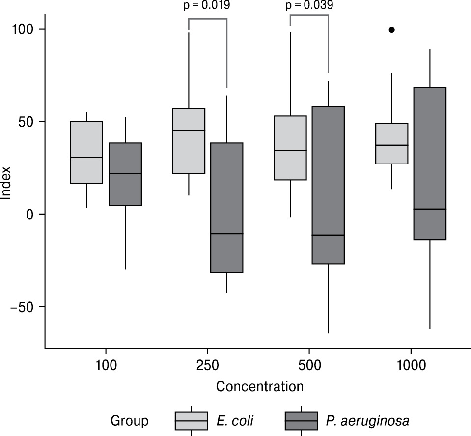 Figure 2. Indices of the bactericidal activity of secretome on clinical strains of E. coli (n = 11) and P. aeruginosa (n = 11) (considering a concentration gradient of 100–1000 µg/ml)