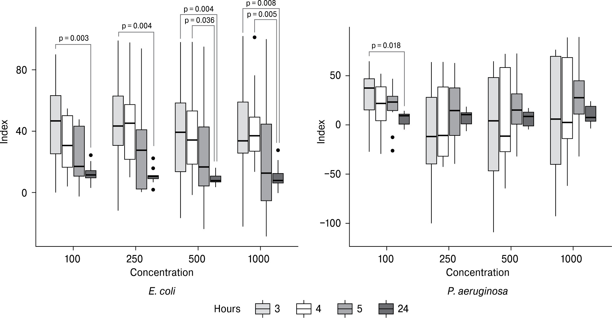 Figure 1. Indices of the bactericidal activity of secretome against E. coli and P. aeruginosa (considering a concentration gradient of 100–1000 µg/ml) after 4 hours of incubation