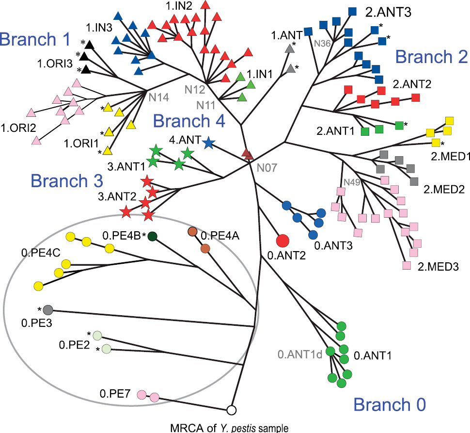 Примечание. MRCA (most recent common ancestor) — абстрактный наиболее современный статистически обоснованный предок вида Y. pestis. N07 — узел политомии (branches 1–4), возникший перед началом 2-й пандемии чумы («Черная смерть»). Овалом выделены «полевковые» геноварианты 0.PE (подвиды) возбудителя чумы, образовавшие зону наиболее древних природных очагов в Евразии.