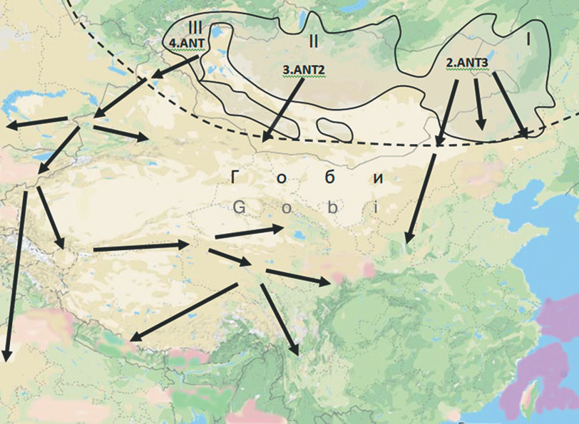 Figure 2. The tritopic origin of the three geneovariantes (subspecies) for the plague microbe Yersinia pestis 2.ANT3, 3.ANT2 and 4.ANT1 in the three geographic populations of the Mongolian marmot Marmota sibirica sibirica (I), M. sibirica caliginosus (II) and M. sibirica ssp. (III) and three independent routes of relevant territorial expansion