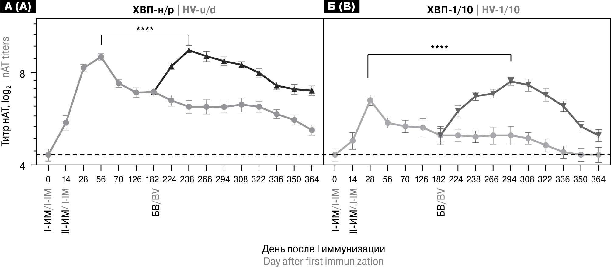 После II-ИМ в группе ХВП-н/р максимальное нарастание нАТ зафиксировано на 56 день (СГТ = 9±0,2) с постепенным снижением титра к 238 дню до 6,2±0,2. На этом уровне антитела оставались до 322 дня с последующим снижением до 5,2±0,3 к концу срока наблюдения. Бустерное введение ХВП на 182 день стимулировало иммунный ответ: максимальные титры антител, зафиксированные через 56 дней (238 дней после I-ИМ), достоверно превышали таковые после II-ИМ (СГТ = 9,48±0,3) (p = 0,001). К концу срока наблюдения уровень нАТ снижался до 7±0,3, статистически достоверно превышая таковой без бустерного введения ХВП-н/р (рис., А).