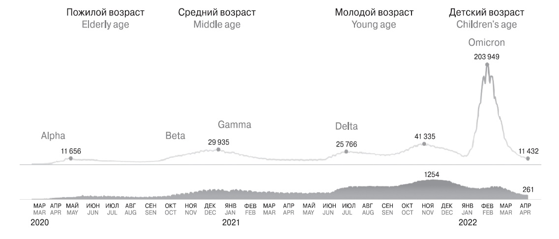 Рисунок 1. Заболеваемость и смертность на фоне разных штаммов SARS-CoV-2 и расширение преимущественного возраста инфицированных пациентов / Figure 1. Morbidity and mortality rate related to various SARS-CoV-2 strains as well as extended preferable patient age