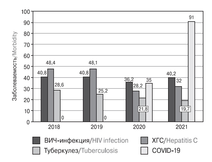 Исходя из этого можно полагать, что маркером проявлений сосуществования COVID-19, ВИЧ, вирусных гепатитов и туберкулеза является не показатель заболеваемости, а течение болезни в целом с участием вируса SARS-CoV-2 в сочетании с индивидуальными показателями пациента и учетом тяжести течения сопутствующих инфекций и летальности. Но показатель смертности для трех социально значимых инфекций на территории СЗФО не выявил роста числа летальных исходов на фоне пандемии [6], исключение составили наиболее тяжелые случаи в условиях стационара, идентичные тем, которые прослеживались при сахарном диабете, метаболических нарушениях и других исходных хронических патологиях со стороны органов и систем (табл. 2) [6, 11].