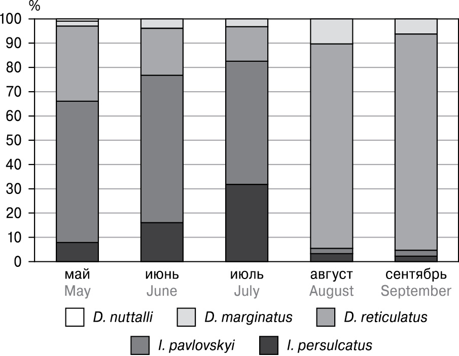 Наиболее часто на человека нападали клещи видов I. pavlovskyi (43,6% среди общей выборки) и D. reticulatus (41,2%); на долю клещей I. persulcatus приходилось 10,7%, на долю D. marginatus — 4,0%. В единичных случаях среди клещей, нападающих на человека, был обнаружен клещ D. nuttalli (0,5%). Распределение видового разнообразия клещей, атакующих человека, очень сильно зависело от месяца исследуемого периода (рис. 1). Так в мае-июне месяце на человека преимущественно нападали клещи I. pavlovskyi (58–61%), а пик удельной активности клещей I. persulcatus приходился на июль месяц, когда его доля увеличивалась до 32% среди всех клещей, собранных с человека. В августе-сентябре практически все нападения на человека были связаны с клещами рода Dermacentor с преобладающим доминированием D. reticulatus (84–90%).