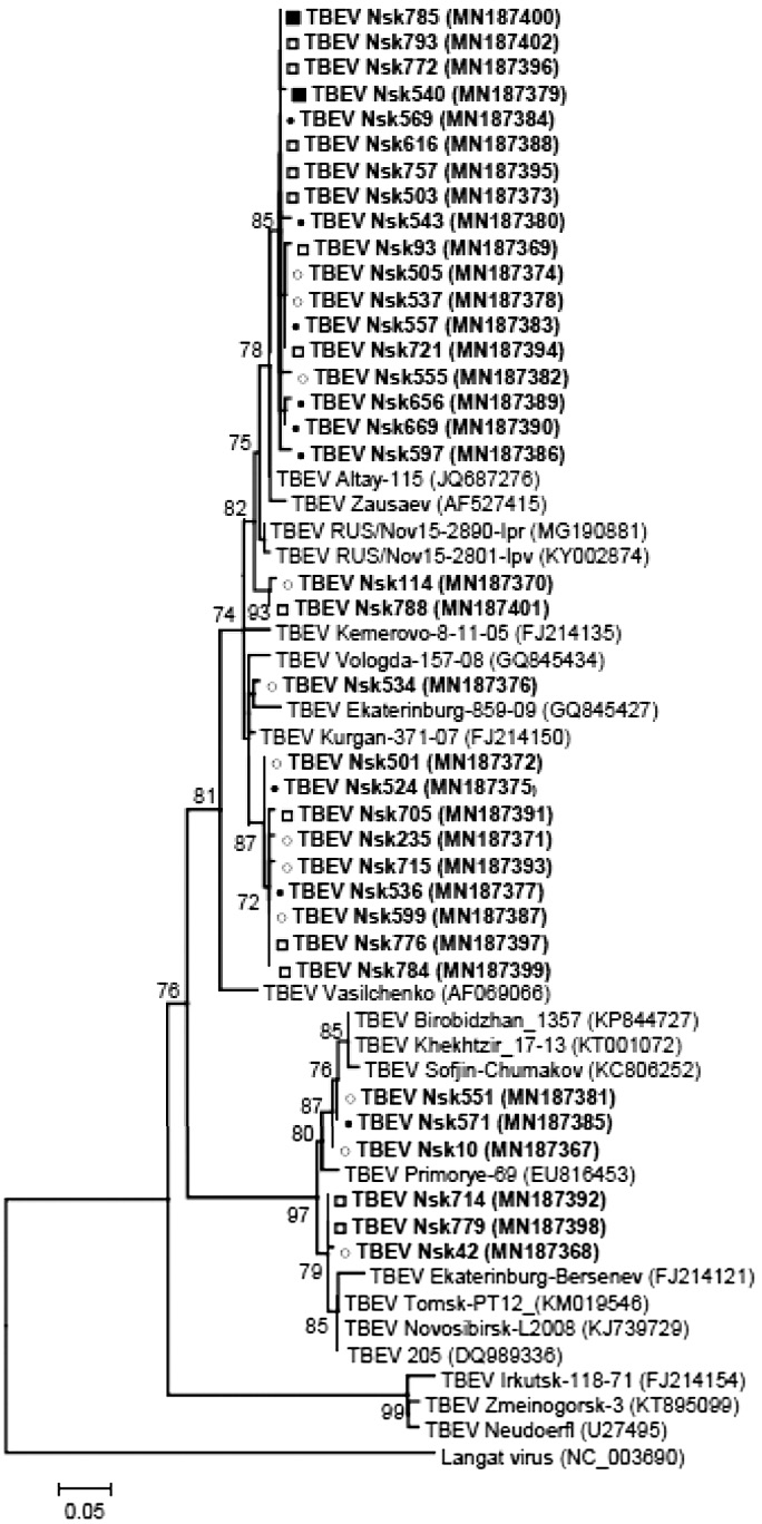 Все исследованные последовательности оказались оригинальными и не имели 100% сходства с известными прототипами ВКЭ (рис. 2). Наибольшее генетическое разнообразие демонстрировал кластер сибирских вариантов ВКЭ, отчетливо распадающийся на две субклады. Варианты одной субклады имеют наибольший уровень гомологии с прототипными штаммами Заусаев (AF52415) и Алтай-115 (JQ687276), а другой субклады — с прототипом Курган-371-07 (FJ214150). Новосибирские изоляты дальневосточного генотипа имеют наибольшее сходство с прототипным штаммом Приморье-69 (EU816453).