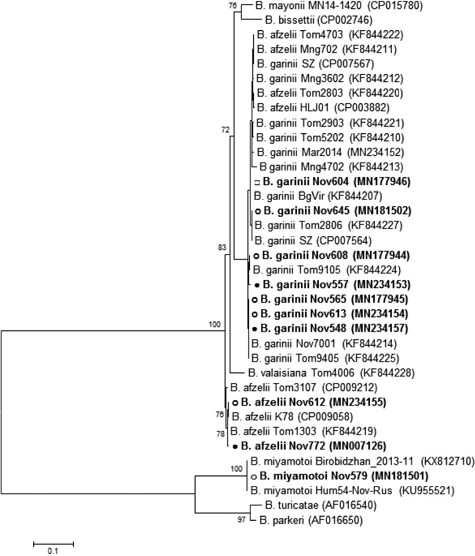 Генетический материал боррелий был обнаружен у 11,2% (95% ДИ: 9,7–14,3) клещей I. persulcatus, а у клещей I. pavlovskyi выявлен в 1,8% (95% ДИ: 0,9–3,5) случаев, у D. reticulatus — в 3,4% (95% ДИ: 2,1–5,6) и D. marginatus — в 5,1% (95% ДИ: 1,4–9,8). Генотипирование выявленных изолятов боррелий проведено по фрагменту гена р66 (около 550 п.н.). Большинство выявленных изолятов боррелий были отнесены к виду B. garinii (86%), 13% изолятов к B. afzelii. В одном таежном клеще был обнаружен генетический материал B. miyamotoi, который оказался генетически близким к изоляту B. miyamotoi выделенному от пациента в г. Новосибирске в 2016 г.