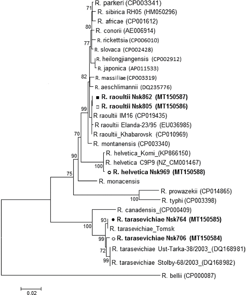 Усредненный уровень инфицированности клещей риккетсиями составил 23,1% (95% ДИ: 20,6–25,1). Генетический материал Rickettsia spp. был выявлен в клещах 4 видов I. persulcatus, I. pavlovskyi, D. reticulatus и D. marginatus. Выявленные изоляты риккетсий были генотипированы путем определения нуклеотидной последовательности фрагмента гена цитратсинтазы gltA (767 п.н.). Показано, что клещи рода Dermacentor имеют большую инфицированность R. raoultii, генетически близкую к изолятам, выделенным ранее во Франции, России и в 2016 г. в Китае от пациента. Клещи рода Ixodes в подавляющем случае заражены R. tarasevichiae. В одном клеще I. persulcatus был найден генетический материал R. helvetica. Уровень инфицированности клещей рода Ixodes составил 16,4% (95% ДИ: 13,3–19,9), Dermacentor — 29,3% (95% ДИ: 25,5–33,2). Для изучаемых изолятов R. raoultii и R. helvetica были определены полноразмерные нуклеотидные последовательности гена поверхностного белка sca4. Последовательность гена sca4 изучаемых изолятов R. raoultii была полностью гомологична изоляту R. raoultii из клеща D. reticulatus в Томской области (MK304550) и на 99,9% прототипному штамму Marne, выделенному из D. reticulatus на востоке Франции (DQ365807). Уровень гомологии с изолятом, выделенным из клеща D. silvarum в Хабаровском крае (Khabarovsk, CP010969), составил 99,5%; а с изолятом, выделенным из клеща D. nuttalli на Алтае (Elanda-23/95, EU036983), — 99,2%. Нуклеотидная последовательность гена sca4 выявленных изолятов R. helvetica оказалась полностью гомологична штамму R. helvetica C9P9 (AF163009), выделенному в Швейцарии из клеща I. ricinus.