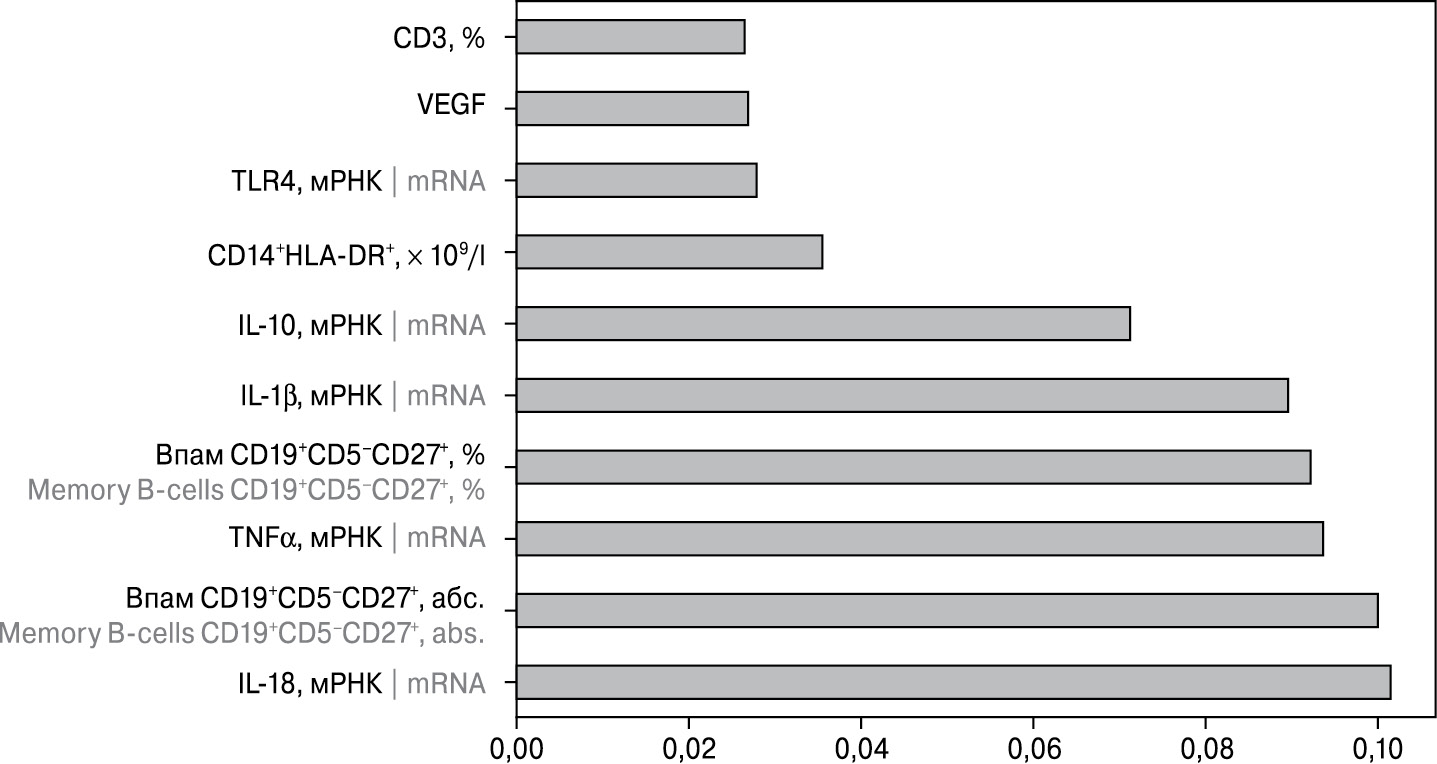 Алгоритм машинного обучения «random forest» выбрал из множества данных корреляционные отношения r ≥ 0,5 (как положительные, так и отрицательные) для проведения дальнейшего анализа оператором. Модель машинного обучения «random forest» на 10% с учителем показала следующие значимые сочетания данных (рис. 1): VEGF, CD3+, CD14+HLA-DR, CD19+CD5CD27+, а также мРНК TLR4, IL-1b, IL-10, TNFa, IL-18.