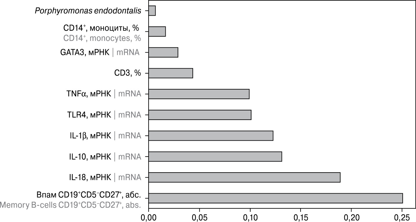 Развитие примененной модели «random forest» машинного обучения с учителем уже на 25% показала отличия (рис. 2): P. endodontalis, GATA3, CD3+, CD14+, CD19+CD5CD27+, а также мРНК TLR4, TNFa, IL-1b, IL-10, IL-18.