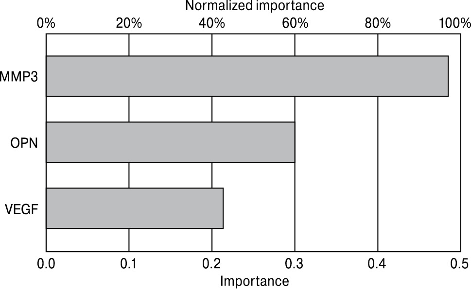 Figure. The importance of the biomarkers for differentiation between severity states of the rheumatoid arthritis patients by neural network analysis