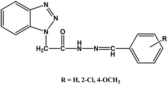 The composite used in our study was synthesized from a series of eleven novel heterocyclic compounds that were tested in a study on bacteria [26], in which the fifth compound proved to be very effective against gram-positive and negative bacteria. The preparation of heterogeneous rings was carried out based on the reactance of benzotriazole present in some compounds (6, 7, 8, 9, 11) described previously in [1] and with chloroethyl acetate ester. Hydrazone was made from the condensation of hydrazide with the replacement of benzaldehyde in ethanol. From the reaction of an ester with aqueous hydrazine and the reaction of hydrazine with hydrazonebenzaldehyde, the heterocyclic effective compound ((C15H12N5OCL)2-benzo(d)(1,2,3)triazol_1_yl)_N_bennzylideneacetohydrazine) was formed. The structure of the synthesized ingredient was checked by calculating the melting point and the infrared spectrum. The specifications of the ingredient were as follows: IR =:1652 (C=O), 1620 (C=N), 3311 (NH), as.1265 (C-O-C), sy.1104 (C-O-C), 1HNMR = 3.6 (O-CH3), 7-7.5 (4H-Ph), 8.1 (Ph-CH), 8 (NH), 5.1 (N-CH2), R group: 2-Cl, UV spectrum: 294, molecular formula: C15H12N5OCL, melting point: 210–212°C, harvested percentage: 57, color: leady, Fig. 1.