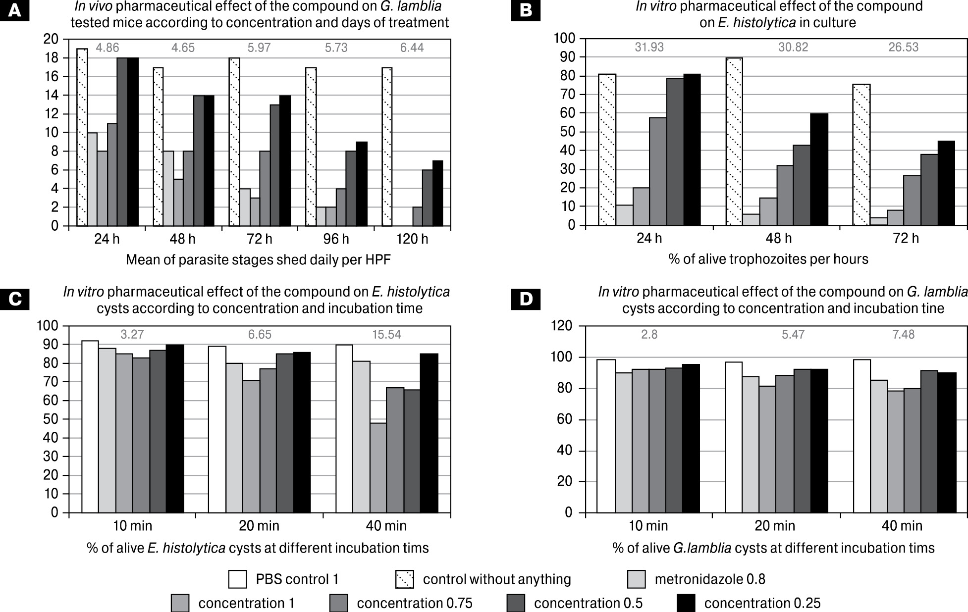 In vitro evaluation of the heterocyclic compound on E. histolytica and G. lamblia cysts. The cystic stage was more resistant to the effect of the synthetic compound for both parasites, although the effect of the compound exceeded that of metronidazole, especially at the highest concentration and during the forty minutes of incubation. The effect of the compound was greater than metronidazole. Indeed, we obtained a percentage of inhibition and death of 46.7% for Entamoeba cysts and 20.4% for Giardia cysts with the synthetic compound, while the inhibition rate with metronidazole was 10% and 13.3%, respectively for Entamoeba and Giardia (Fig. 2, C, D). We also observed that the effect of the substance on the dead cystic stages was evident in the deposition of the substance around the nuclei of the cystic stages and the cyst wall, which gave it a very visible and prominent appearance, especially for the cystic stages of the Entamoeba parasite.