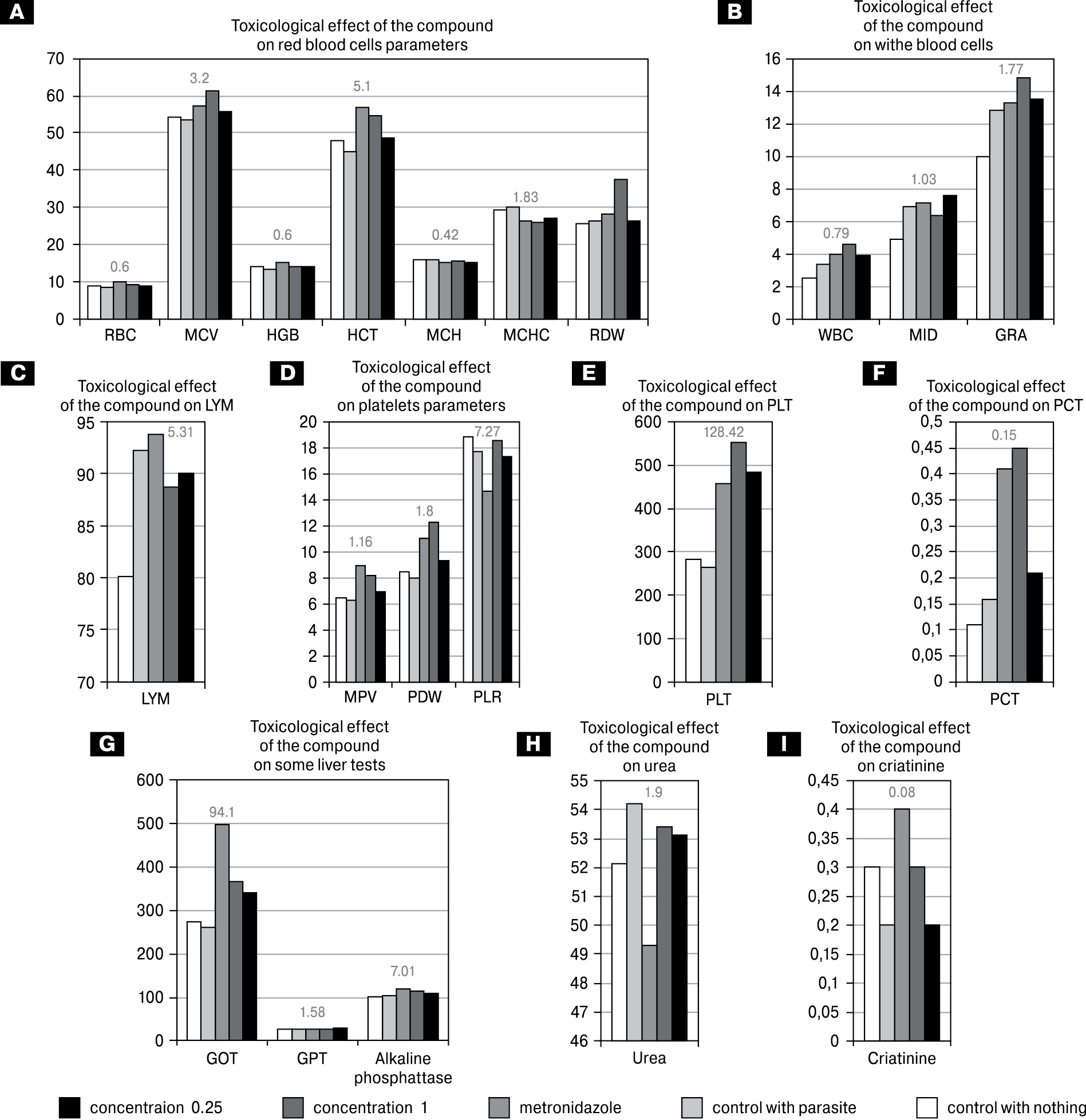 To test the toxicity of our compound in our study we proceeded to sacrifice the mice that received different concentrations (the highest and the lowest doses) of our compound (C15H12N5OCL) and metronidazole to obtain blood and serum samples. Blood samples were collected in EDTA and dry tubes and used to measure some hematological parameters such as red and white blood cells and platelets. For analysis, about 500 μl of blood was added to the CBC apparatus type Swelab (Swedish made) for analysis and we printed all the results for each realized test. On the other hand, serum was used to evaluate the effect of the compounds on liver and kidney function (GPT, GOT, alkaline phosphatase, urea, and creatinine) were measured. Thus, with the help of the Cobas type chemistry analyzer (German made), we used 150 μl of serum to test the liver and kidney function and all the test results were printed and analyzed. To finish with this aspect of our study, we took the blood samples from infected mice untreated with any substance and uninfected mice for comparison as control groups.