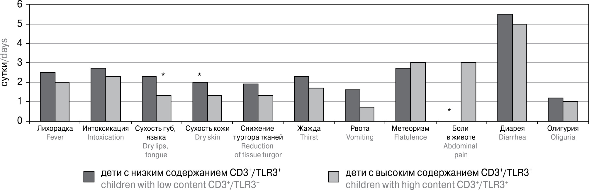 Учитывая более продолжительное сохранение признаков эксикоза в группе детей с низким содержанием CD3+/TLR3+, вполне логично, что длительность инфузионной терапии у них, проводимой с целью регидратации и дезинтоксикации, оказалась достоверно выше по сравнению с детьми, у которых количество иммунокомпетентных клеток, экспрессирующих TLR3, было высоким — 3,0 (2,7–3,3) против 0,7 (0,0–1,4) суток (р < 0,05 по χ2 критерию Пирсона и критерию Манна–Уитни). Также лишь в этой группе к проводимому лечению была добавлена антибактериальная терапия на протяжении 2,1 (1,4–2,8) суток по причине присоединения к ротавирусу бактериальной флоры, что выражалось в появлении на 2–3 день с момента госпитализации у пациентов патологических примесей — зелени и слизи — в кале, сохранении лихорадки.
